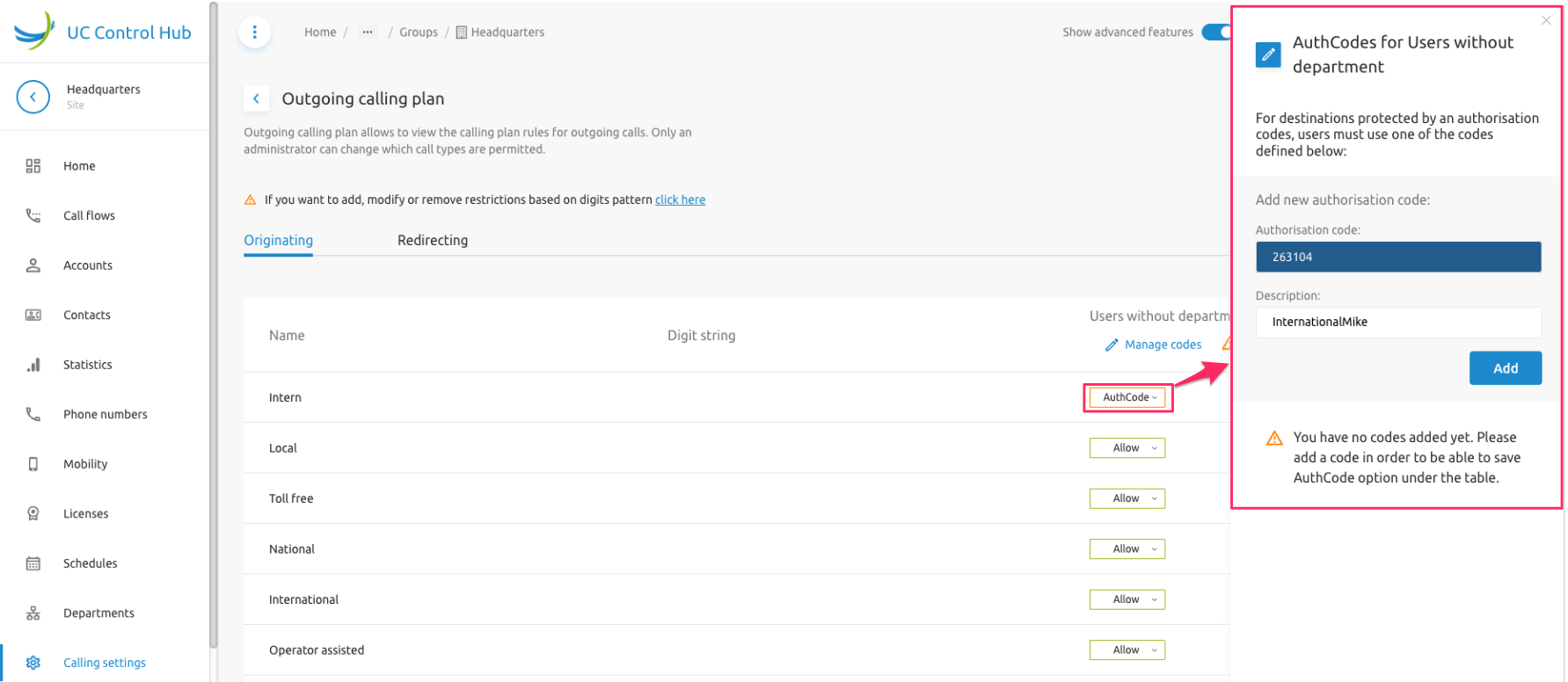 Enhanced Outgoing Calling Plan (E-OCP) is now supported in the Self Care Portal. Outgoing Calling Plan (OCP) Authorisation codes can now be managed by Tenant and Group Admins when the service is assigned to the Group. Note: Incoming Calling Plan and Outgoing Calling Plan settings are now both located in the Calling Settings menu